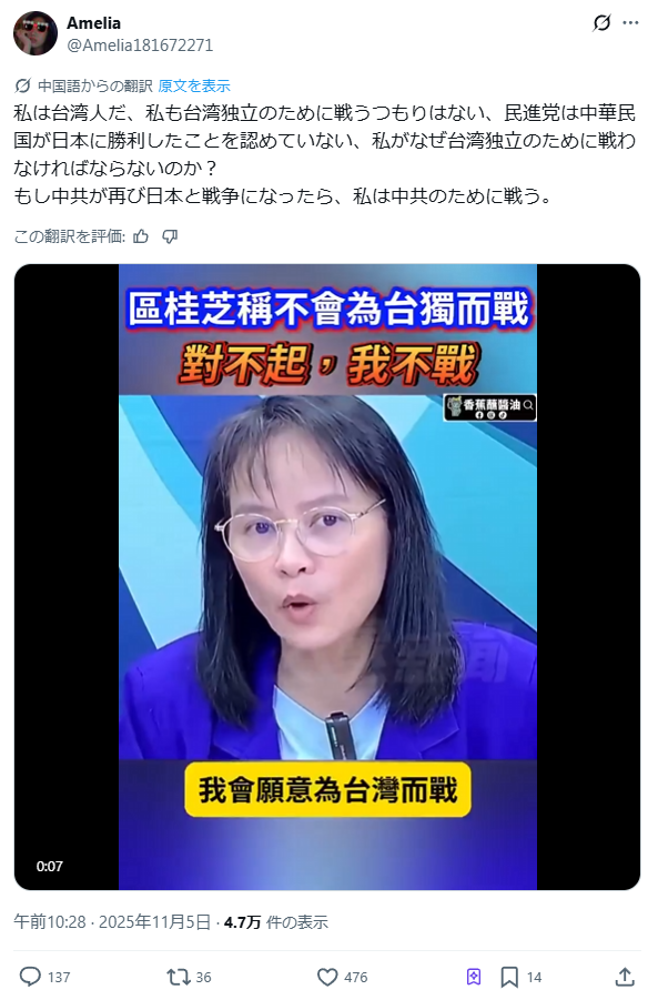それから、おそらく台湾の政治家だと思いますが中国寄りの人のようで、過激な発言をしています。