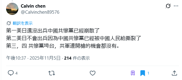 中国共産党そのものが既に崩壊、分裂しているので張りぼてでしかなく、日本とアメリカは介入しない、中国人民解放軍の出る幕はないだろう。という見解のようです。