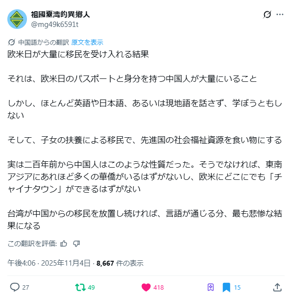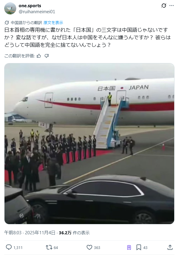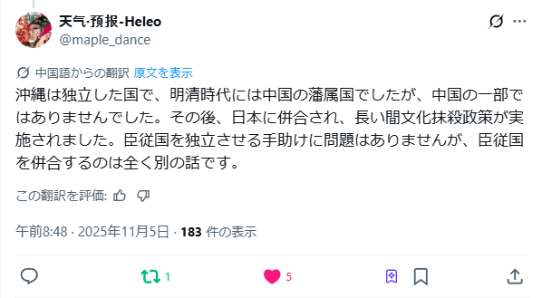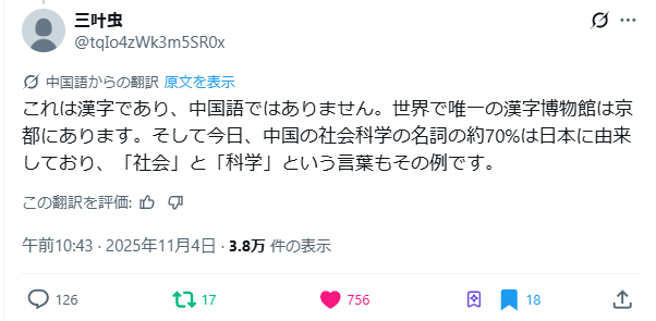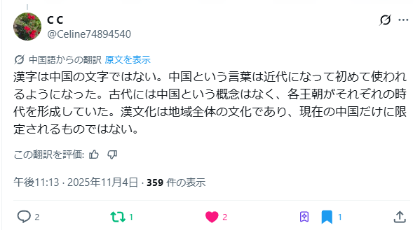 X(旧ツィッター)でこのような中国人による妄言を見つけ、思わず拒絶反応が出てしまいました。