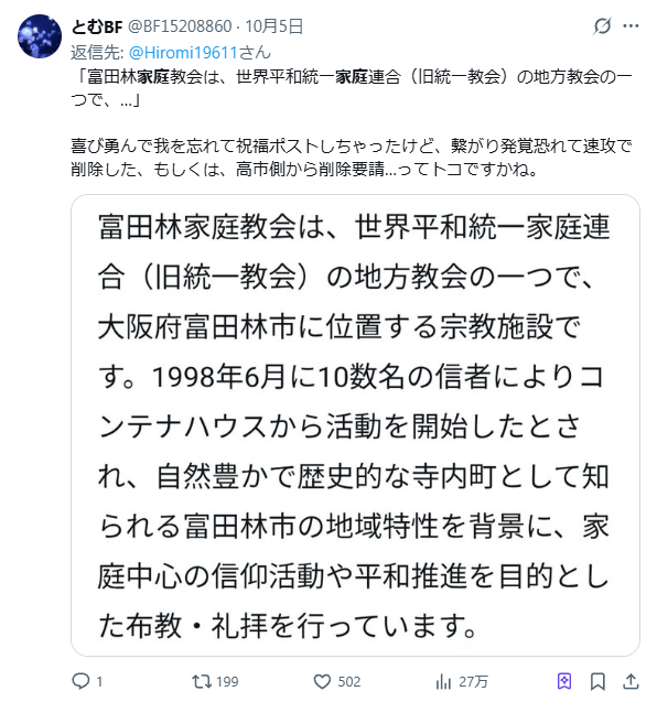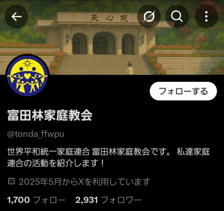 世界平和統一家庭連合 富田林家庭教会は旧統一教会の一つだそうです。